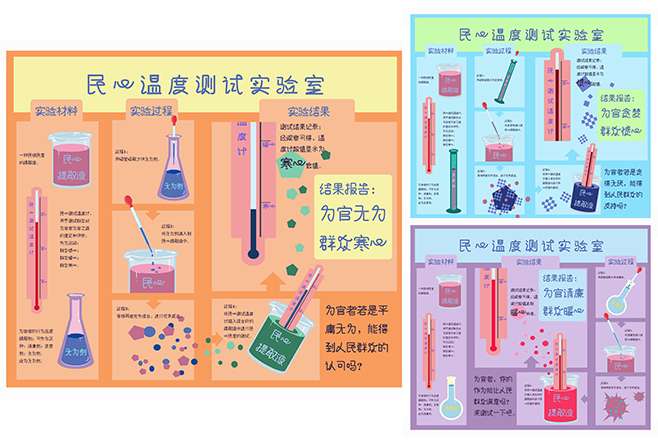 创意说明:一支三心刻度的民心测试温度计 ,三次民情民意的丈量 ,获得实验结论如下:为官贪心 ,群众愤心  ;为官无为 ,群众寒心  ;为官清廉 ,群众暖心 。