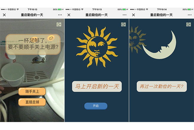 创意说明:该H5作品通过真情实景的拍摄与实时界面的交互 ,模拟一样平常生涯中需要做出的“俭”或“不俭”的选择 ,指导观众选择并重启自己的一天 。