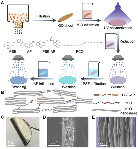 ͼ1. ÓÐÐò½»ÁªÊ¯Ä«Ï©±¡Ä¤µÄÖÆ±¸Àú³Ì(A-B)¼°ÕÕÆ¬(C)ºÍºá½Ø¶ÏÃæÎ¢¹ÛÐÎò(D-E)