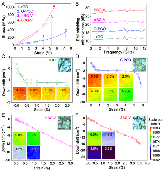 ͼ2. ÓÐÐò½»ÁªÊ¯Ä«Ï©±¡Ä¤µÄÁ¦Ñ§(A)ºÍµç´ÅÆÁÕÏЧÄÜ(B) £¬ÒÔ¼°Ô­Î»À­Âü¹âÆ×±íÕ÷(C-F)