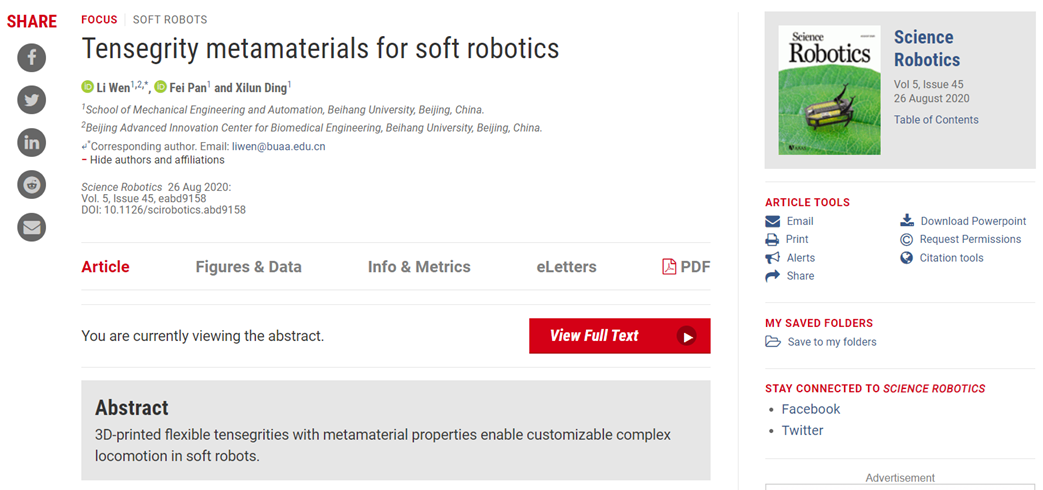 ÂÛÎÄÐÅÏ¢£ºLi Wen, Fei Pan, and Xilun Ding, Tensegrity Metamaterials for Soft Robotics, Science Robotics, 5, eabd9158, 2020.